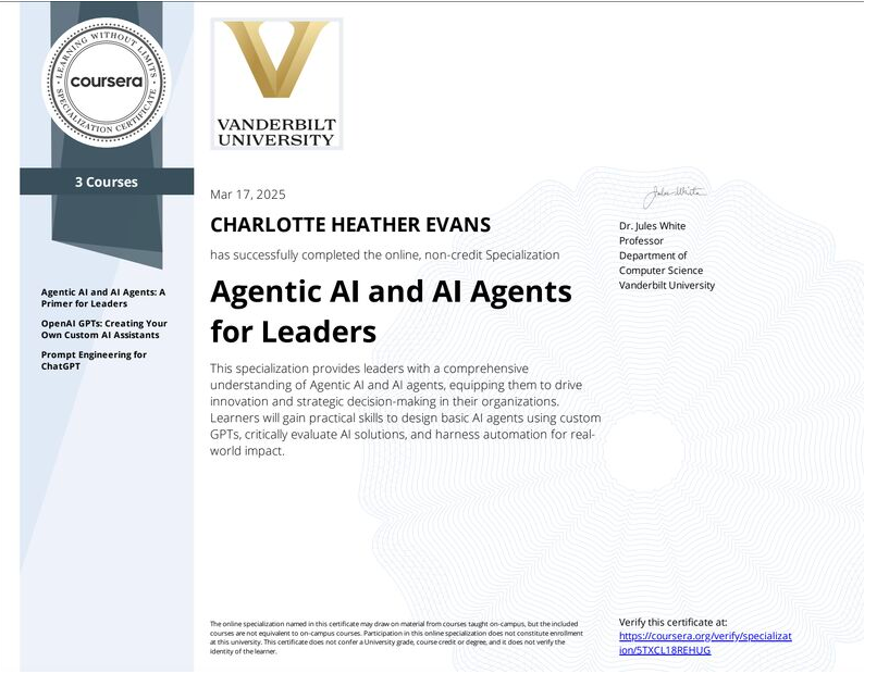 The result is the AI Agent Developer Specialization, a comprehensive program designed to take you from a curious beginner to a confident AI agent builder. Taught by Dr. Jules White, a respected researcher and professor at Vanderbilt, this specialization is more than just a series of video lectures. It's a hands-on, deep-learning experience designed for the real world (source: vanderbilt.edu/generative-ai/coursera).