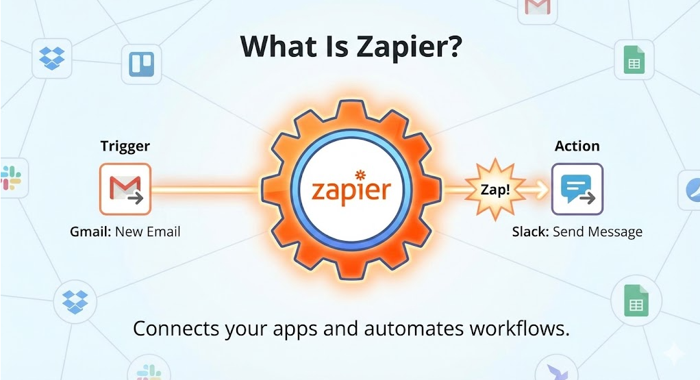 - Zapier is a cloud-based automation platform that connects your apps and services through automated workflows called Zaps, allowing you to automate repetitive tasks without coding.